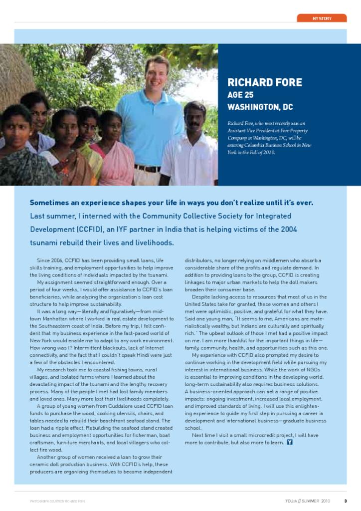 This article by Richard Fore appeared in the Summer 2010 edition of YOUth magazine. Fore is a business student from the United States. In this article, he shares his experience interning with Community Collective Society for Integrated Development (CCSID) in India.