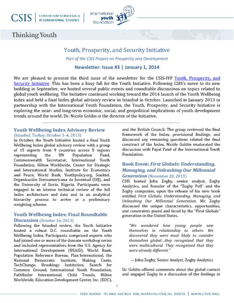 This is the third edition of the newsletter from the Youth, Prosperity and Security Initiative, a joint effort by the International Youth Foundation and the Center for Strategic & International Studies (CSIS) in Washington, DC. It includes updates on a major focus of the Initiative—the development of the Youth Well-being Index—that with the support of Hilton Worldwide will help assess and strategically address issues of youth wellbeing and security around the world. Also included: updates on roundtable discussions and one-on-one conversations with experts in the field of youth development along with related articles and blog postings.