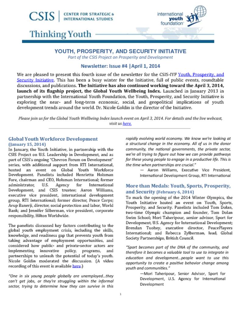 This is the fourth edition of the newsletter from the Youth, Prosperity and Security Initiative, a joint effort by the International Youth Foundation and the Center for Strategic & International Studies (CSIS) in Washington, DC. It includes updates on a major focus of the Initiative—the development of the Youth Well-being Index—that with the support of Hilton Worldwide will help assess and strategically address issues of youth wellbeing and security around the world. Also included: updates on roundtable discussions and one-on-one conversations with experts in the field of youth development along with related articles and blog postings.