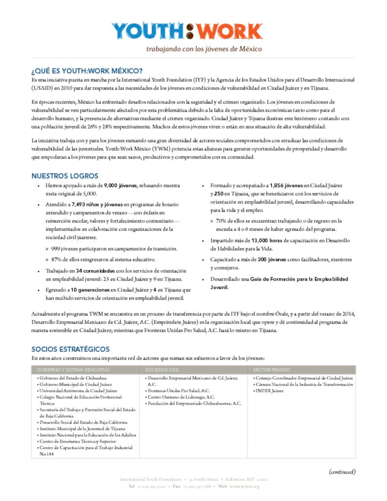 This fact sheet provides a brief description of the Youth:Work Mexico program. The US Agency for International Development (USAID) and the International Youth Foundation launched the program in 2010 to address youth challenges in Ciudad Juarez and Tijuana, two of Mexico’s most violent and crime-ridden communities. Working with local civil society groups, the initiative helps to create safe spaces for disadvantaged young people, strengthen and expand after-school and summer programs, and prepare Mexican youth for viable futures through self or salaried employment. The fact sheet is available only in Spanish.