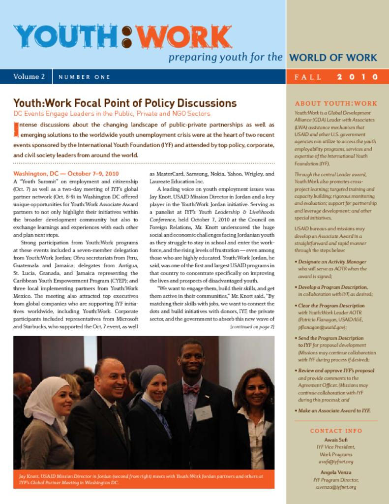 This Fall 2010 edition of the Youth:Work newsletter discusses a three-day event in Washington, DC, highlighting Youth:Work programs in Jordan, Mexico, and Latin America and the Caribbean. The newsletter also includes country updates for all Youth:Work programs, including new initiatives in Africa, Kyrgyzstan, and the West Bank/Gaza.